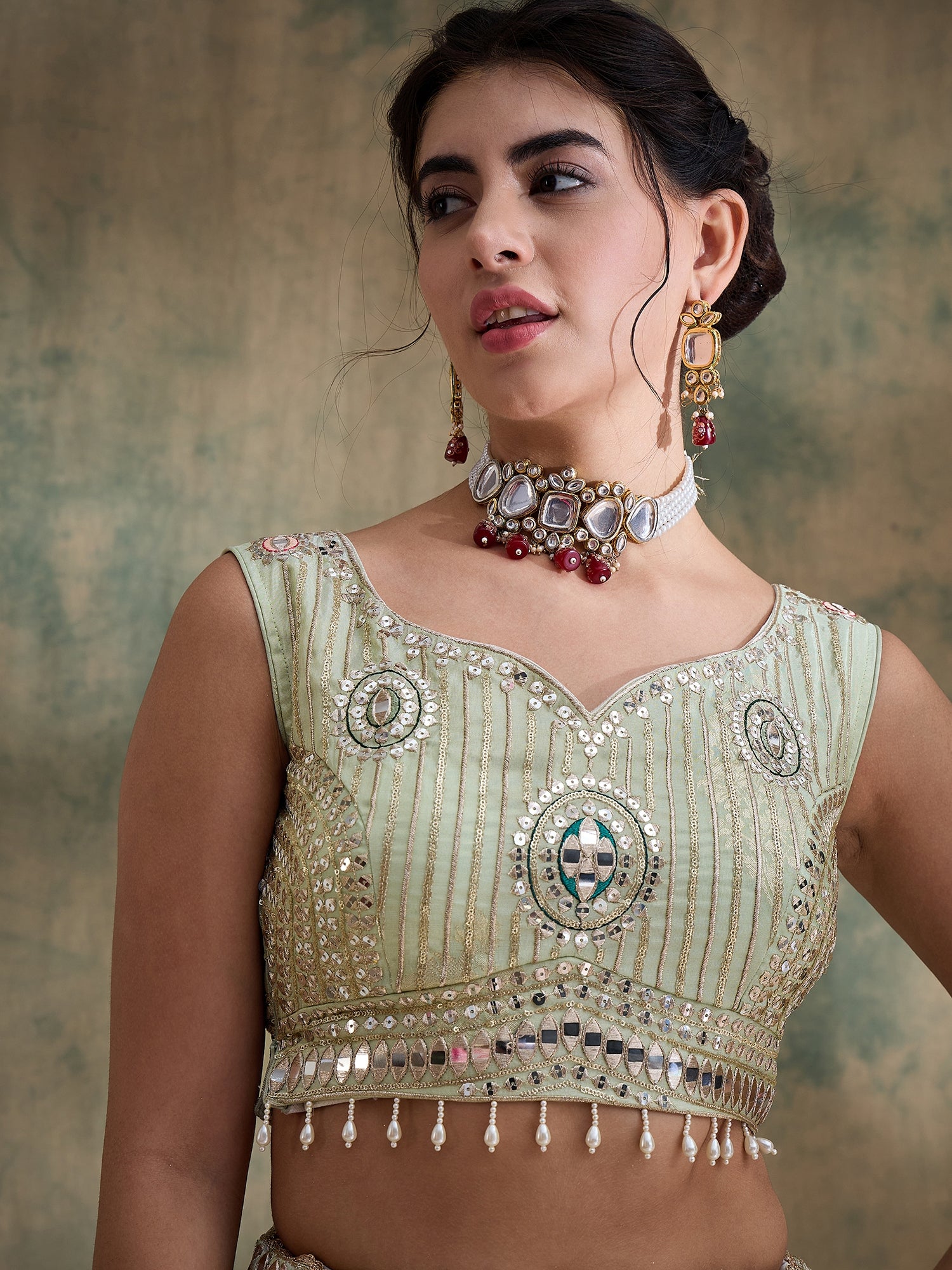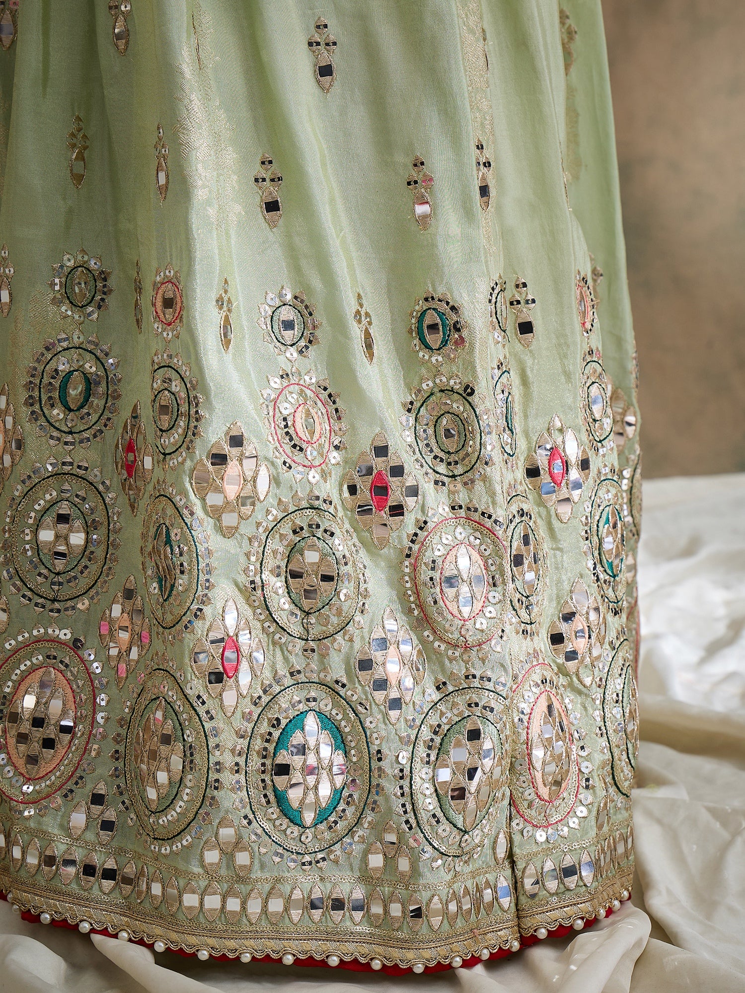 A luxurious pistachio lehenga crafted in pure viscose jacquard jari tissue, adorned with intricate jari and sequin work, highlighted by vibrant thread detailing. Paired with a rich, handcrafted Rani Gaji Bandhej dupatta featuring an elegant 2.5-inch embroidered sequin border, the set is finished with artisanal latkans and a meticulously tailored mirror-embroidered blouse for a cohesive, elevated look.
