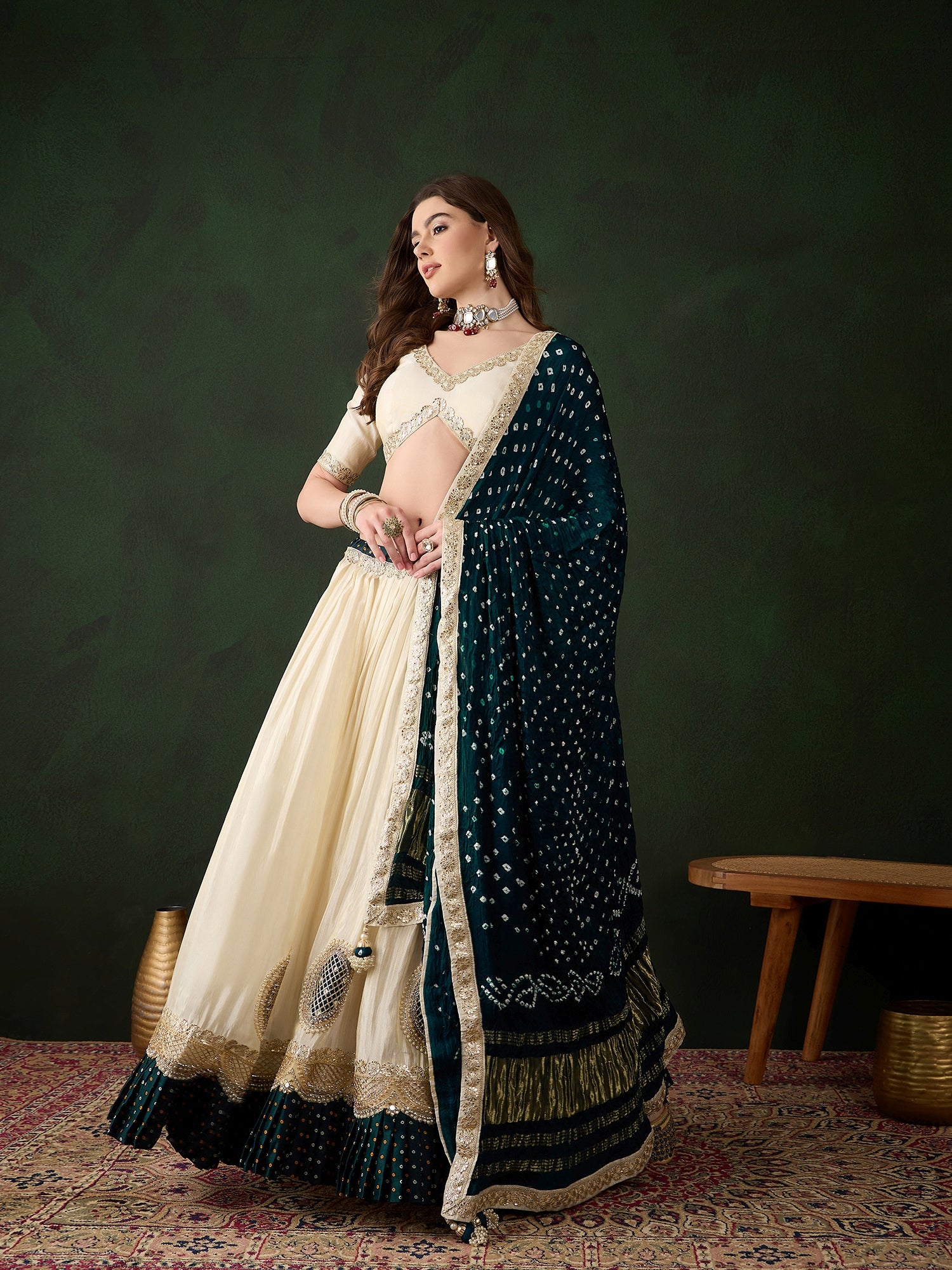 A pure viscose slub-tissue lehenga, highlighted with a delicate interplay of pearl and diamond accents along the border, is further elevated by a beautifully pleated Petrol Blue gaji silk trim that enhances the ensemble’s visual richness. Paired with an elegant bandhani dupatta, this creation harmonises traditional artistry with contemporary sophistication.