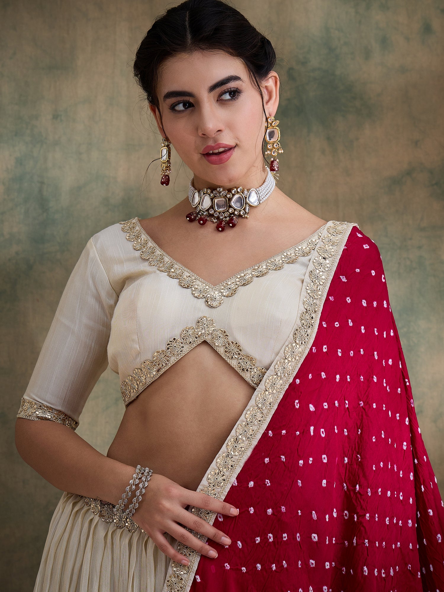 A pure viscose slub-tissue lehenga, highlighted with a delicate interplay of pearl and diamond accents along the border, Elevated by a beautifully pleated Rani gaji silk trim that enhances the ensemble’s visual richness. Paired with an elegant bandhani dupatta, this creation harmonises traditional artistry with contemporary sophistication.