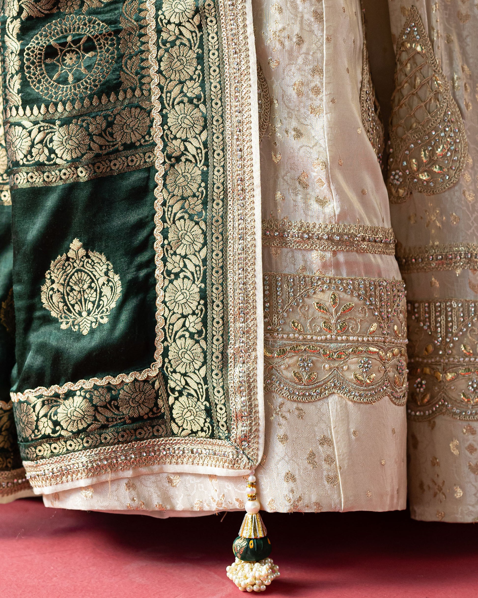 An off-white lehenga adorned with an exquisite gotapatti and diamond cutwork border along the Daman, further elevated with intricate patch detailing. It is paired with a heavy Green pallu dupatta showcasing delicate patchwork artistry across the pallu. The ensemble is completed with our signature-touch blouse, adding a distinctive and refined elegance to the entire look.