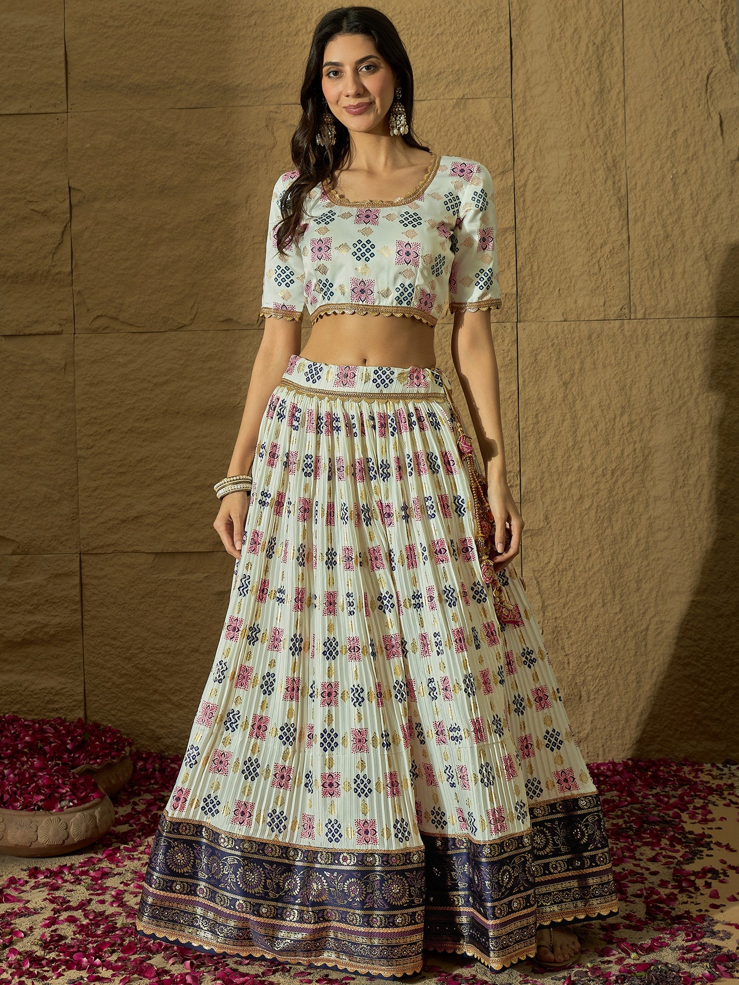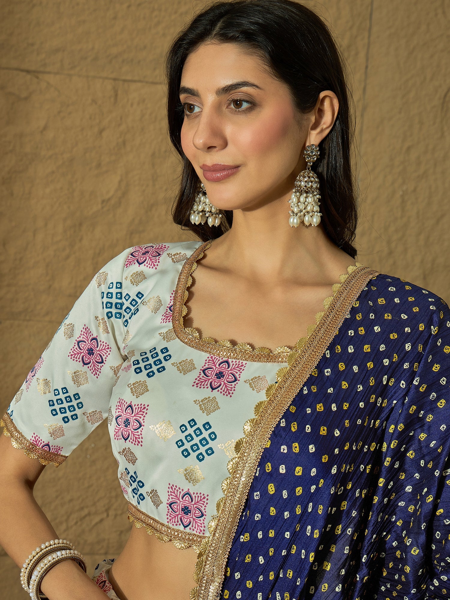 A heavy Lehenga Choli set featuring a pristine Ajrakh white lehenga paired with a rich navy-blue Bandhej dupatta. The lehenga is adorned with intricate Ajrakh table prints and elevated with a beautifully detailed heavy daman border. Completed with a navy-blue Bandhej print dupatta finished with an elegant jari edging, this ensemble embodies timeless tradition and refined craftsmanship.